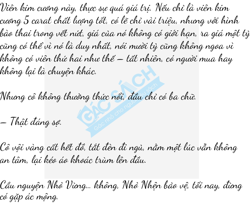 Cô tắt đèn lớn, mò mẫm bật đèn đeo đầu, lấy kính lúp mười lần chuyên dụng ra, ngắm nhìn viên kim cương trên chiếc nhẫn.